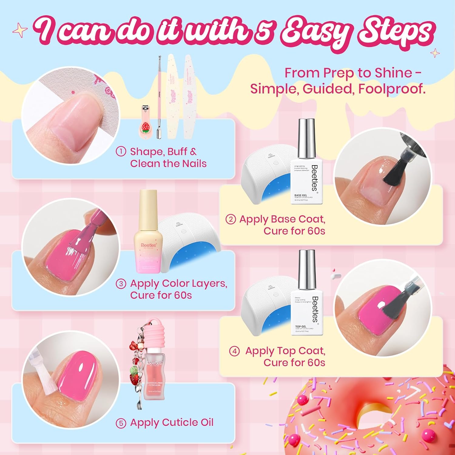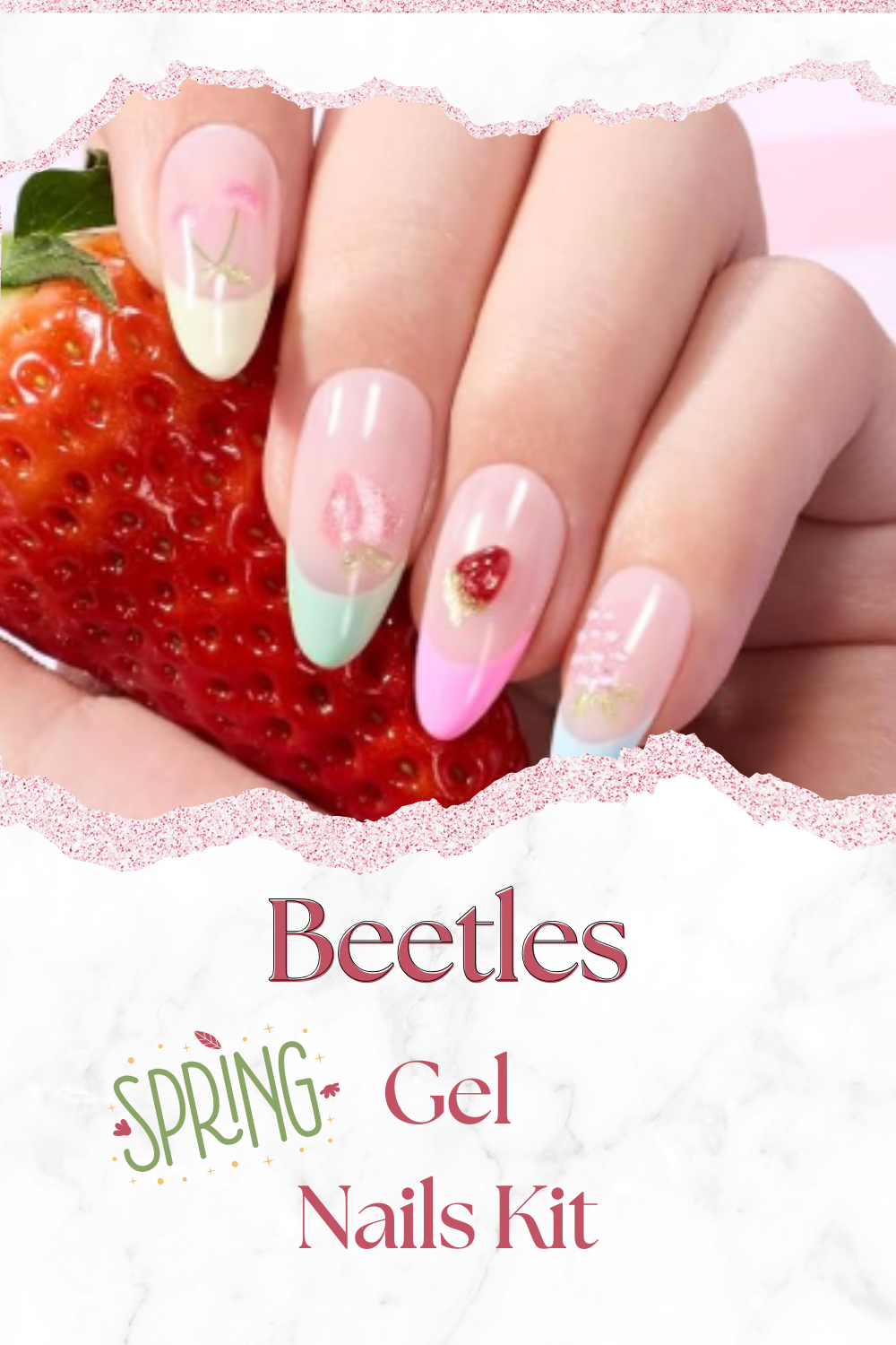 It comes with six soft gel shades that are absolutely perfect for spring. The set also includes colorful frosting top coats, a strawberry pink sculpting gel, and fun 3D dessert-inspired nail accessories to take your manicure to a whole new level of adorable!