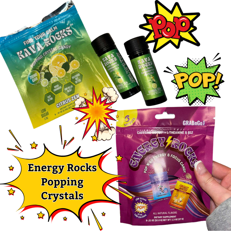 Kava Rocks and Energy Rocks are pop crystals (like pop rocks!) and they are made for adults. They offer a fun flavor base, a playful fizzy popping texture, and a portable way to enjoy either relaxation or energy support in a popping candy form, yay!!!